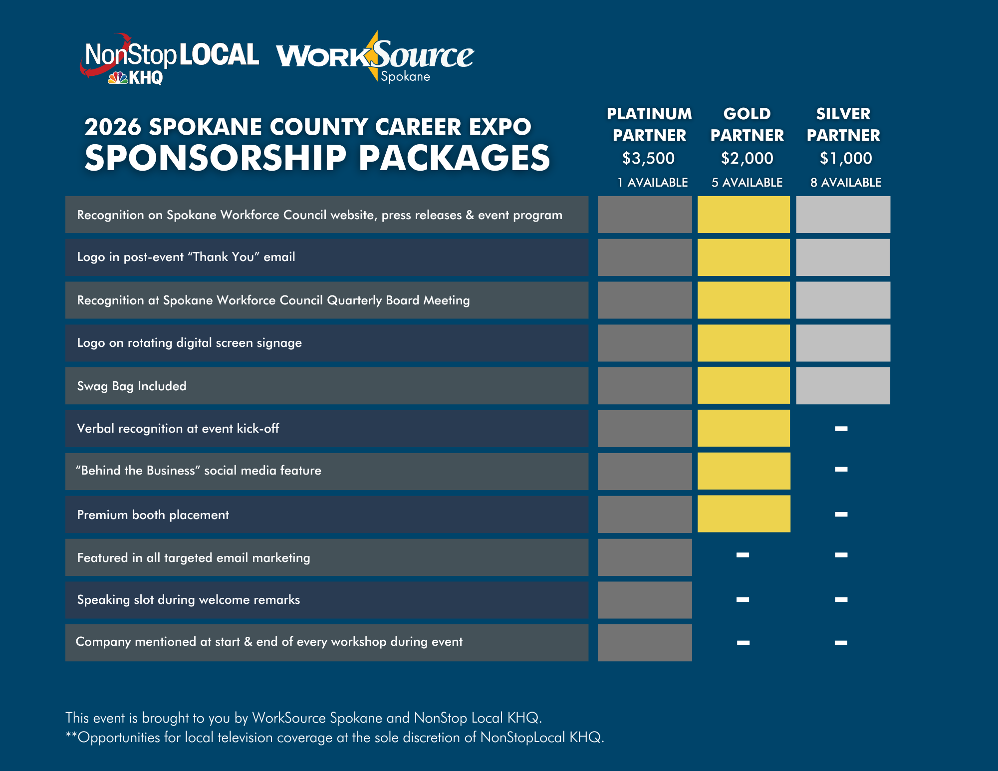 Put your brand in front of hundreds of job seekers and employers at Spokane County's largest Career Expo. Sponsorship is a chance to support local workforce development while gaining visibility with the community you serve.